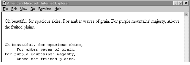 Sure it's a familiar refrain, but it won't look so familiar in a browser if you leave it between paragraph tags. Instead, you can use the <PRE> tag to keep things exactly the way you want them: