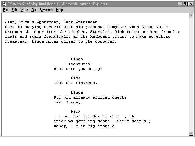 It takes a little tapping on the space bar, but with the <PRE> tag you can create some fairly elaborate layouts for getting your point across-especially when layout is just as important as the text itself. In a browser, it comes out looking like a big-budget picture script (see fig. 7.7).
