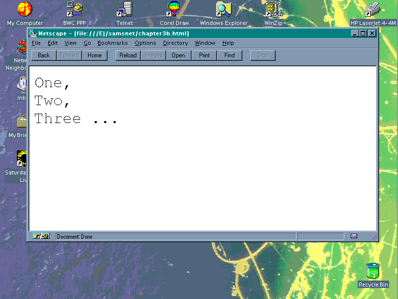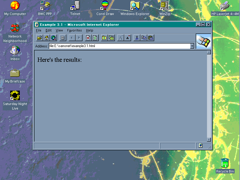 This HTML file produces results similar to those in Figure 2.1. By comparison, using a browser that doesn't support JavaScript (such as NCSA Mosaic), the results look like those in Figure 2.2.