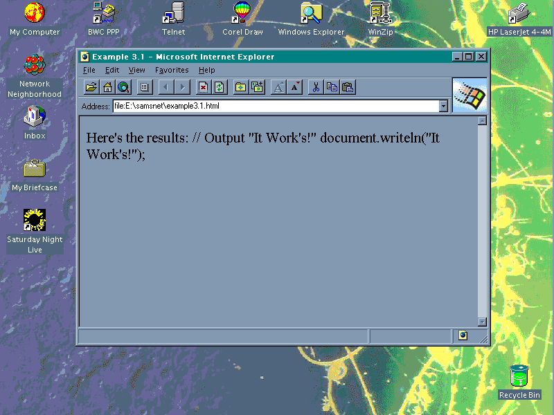 To compare, delete the HTML comment lines, and the output looks like Figure 2.3. You can see that the entire JavaScript command document.writeln("It Works!<BR>"); has been displayed, and the <BR> tag has been interpreted by Mosaic.
