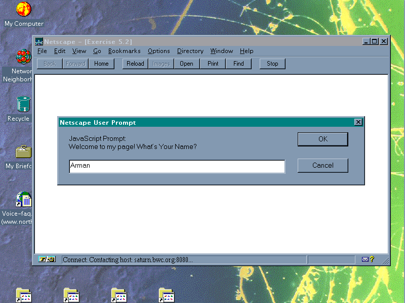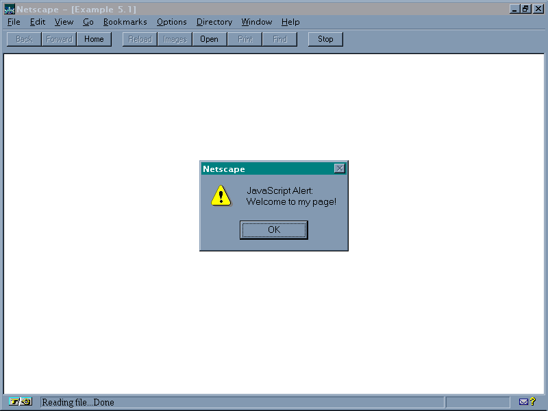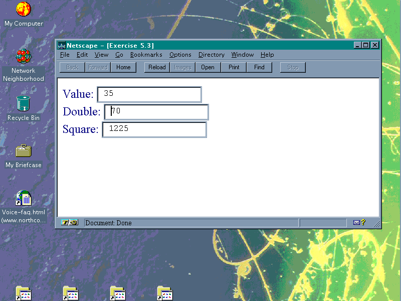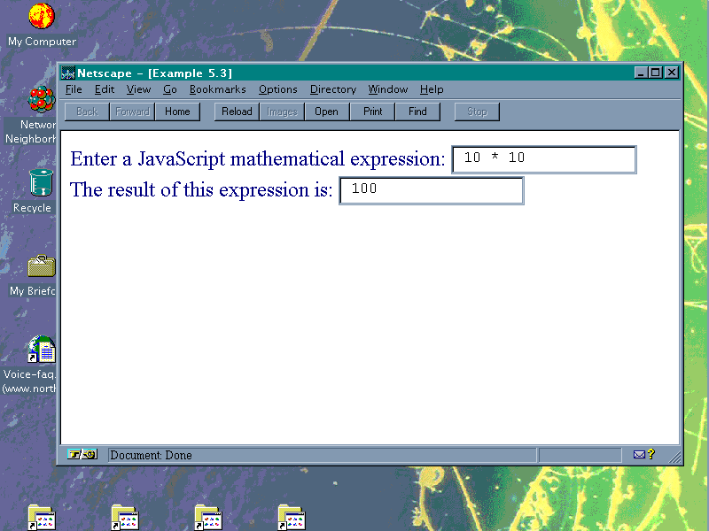 <TITLE>Example 5.3</TITLE> <SCRIPT LANGUAGE="JavaScript"> <!-- HIDE FROM OTHER BROWSERS function calculate(form) { form.results.value = eval(form.entry.value); } function getExpression(form) { form.entry.blur(); form.entry.value = prompt("Please enter a JavaScript mathematical expression",""); calculate(form); } // STOP HIDING FROM OTHER BROWSERS --> </SCRIPT> </HEAD> <BODY> <FORM METHOD=POST> Enter a JavaScript mathematical expression: <INPUT TYPE=text NAME="entry" VALUE="" onFocus="getExpression(this.form);"> <BR> The result of this expression is: <INPUT TYPE=text NAME="results" VALUE="" onFocus="this.blur();"> </FORM> </BODY> </HTML>
