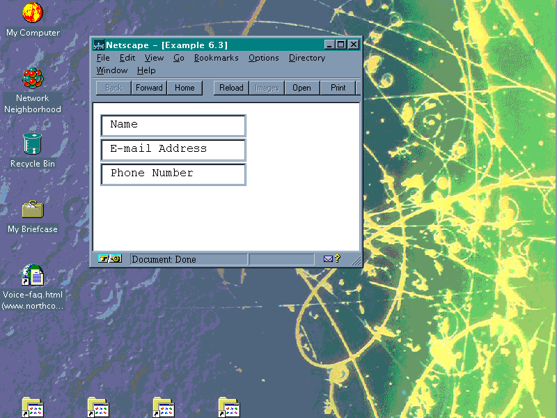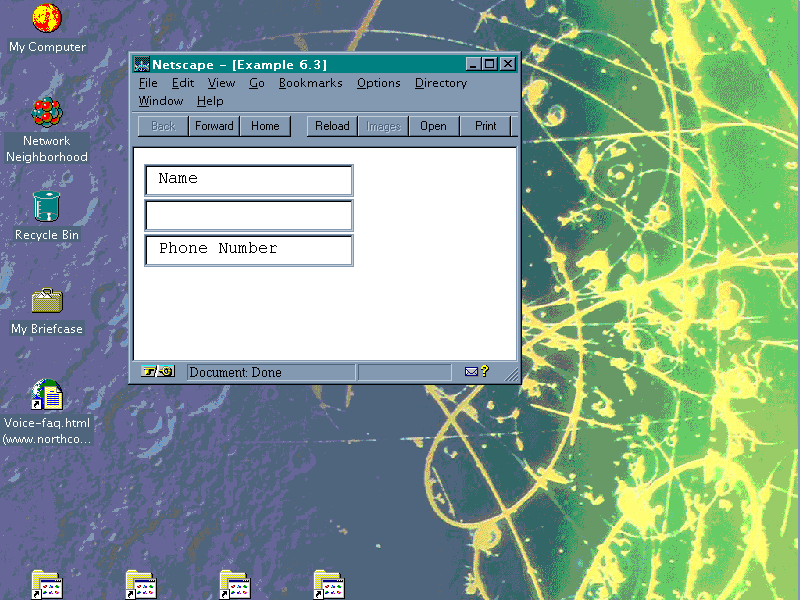 In the above INPUT tag, a button named name is created. The VALUE attribute contains the text that the Navigator browser displays in the