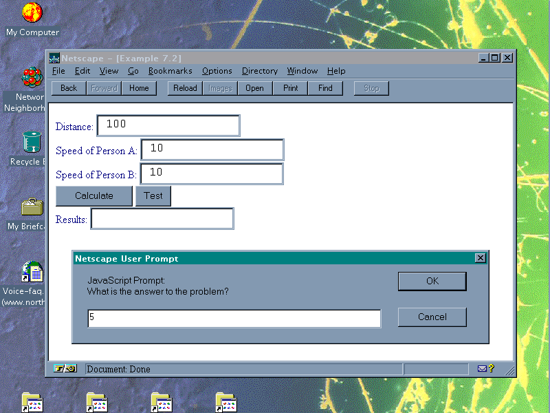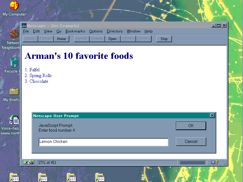 document.write(i + ". " + prompt('Enter food number ' + i,'food') + '<BR>');