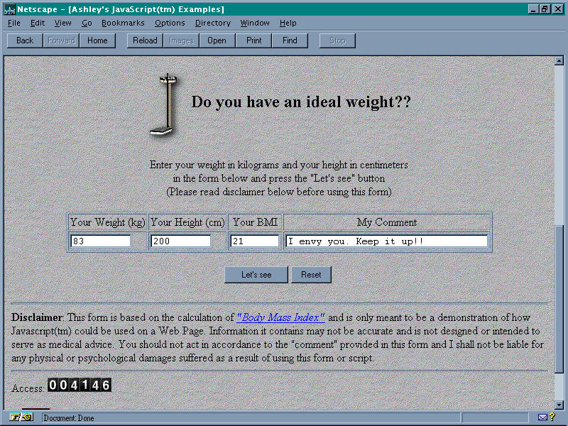Dr. Cheng's page has two JavaScript applications on it: a countdown to China's take over of Hong Kong and the weight calculator we are interested in.
