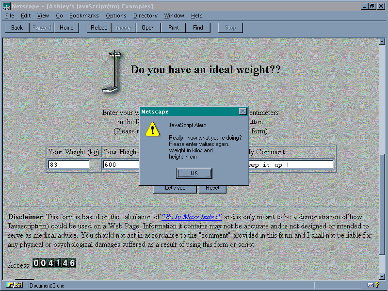 alert("\nReally know what you're doing? \nPlease enter values again. \nWeight in kilos and \nheight in cm");