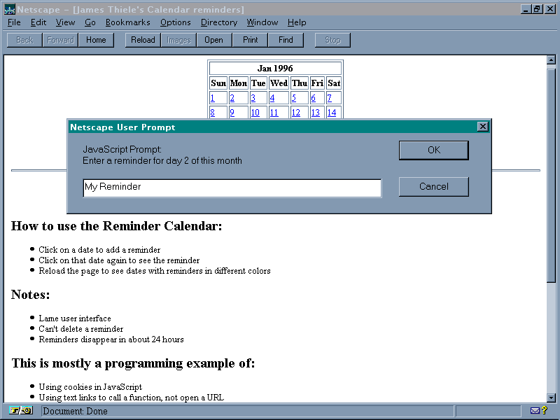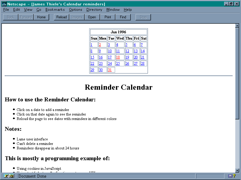 James Thiele has designed a simple reminder calendar as an example using cookies in JavaScript. The calendar is available at