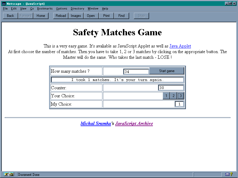 Michal Sramka has used JavaScript to produce one of the traditional games used in many programming courses: the matches game. His game is on-line at http://www.sanet.sk/~ms/js/matches.html.