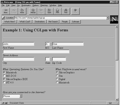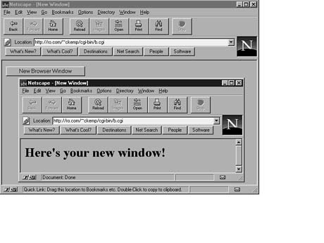 Ever wonder how you could open a new browser window? This simple example in Listing 5.2 illustrates how CGI.pm can be used to generate a form with a target element that points to a new window. When you click the button on the first page, a new window some_target is opened to display the output in the else clause. The output from Listing 5.2 is shown in Figure 5.4.