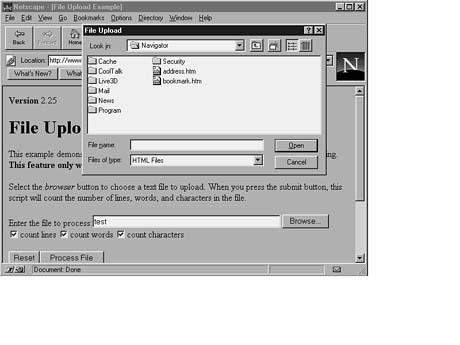 Listing 5.3 shows how CGI.pm and CGI::Carp can be used with Netscape 2.0+ browsers to make possible the transfer of files from the browser to the server. CGI.pm is used to set up a multipart form that accepts the data in the file. Then the filefield() returns a file upload field that causes a window on the remote browsers machine to be created, prompting them for a file to transfer. The filefield() has the following parameters: