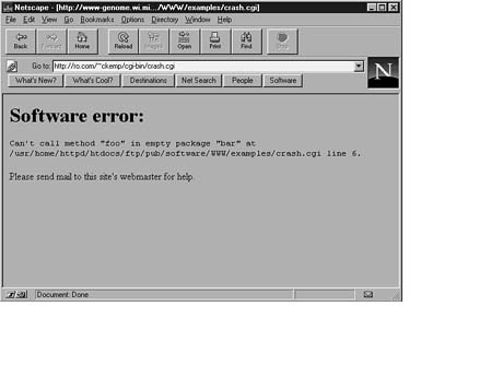 Listing 5.4 is an example of script using CGI::Carp qw(fatalsToBrowser) that will fail due to the garbage-line foo bar baz;. Instead of getting a "Server Error," the output looks like Figure 5.6.