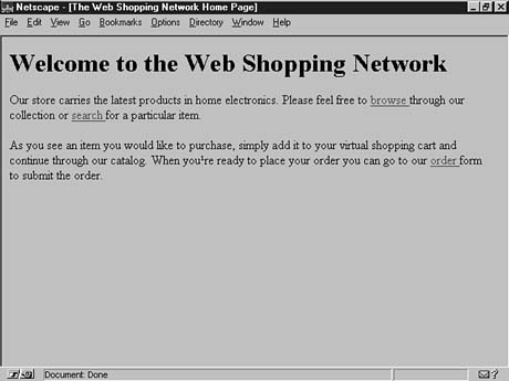 <HTML><HEAD> <TITLE>The Web Shopping Network Home Page</TITLE> </HEAD> <BODY> <H1>Welcome to the Web Shopping Network</H1> <P> Our store carries the latest products in home electronics. Please feel free to [page browse] browse [/page] through our collection or [page descsrch] search [/page] for a particular item. <P> As you see an item you would like to purchase, simply add it to your virtual shopping cart and continue through our catalog. When you're ready to place your order you can go to our [page order] order [/page] form to submit the order. <P> </BODY></HTML>