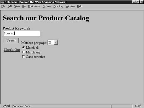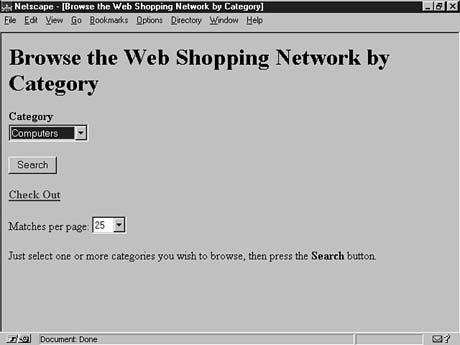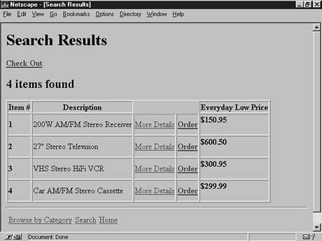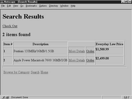 Catalog pages are simply HTML files with some additional markup. The additional markup consists of MiniVend tags that are enclosed in square brackets [] rather than HTML's angle brackets <>. The page flow under normal circumstances consists of catalog.html to order.html to confirmation.html. The catalog page can be as simple or as complex as you like. I suggest that you start out simple and then add features as you become more familiar with the capabilities. The catalog page for the example in this chapter will remain simple. Here, you provide a search page and a browse-by-category page. The HTML with additional MiniVend markup is shown in Listing 13.1, and the resulting page is shown in Figure 13.1.