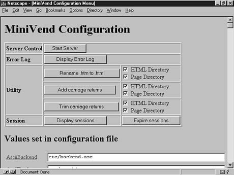MiniVend can run in two different modes. In static mode, each CGI catalog request loads the database to generate the catalog page. In server mode, you start up a MiniVend server process that loads the product database once and serves the remaining CGI requests with the product information. As you can well imagine, server mode is much faster and is recommended. When you run in server mode, and your server goes down for some reason, one nice feature causes an automatic e-mail notification when someone attempts to access your catalog but cannot do so because the server is down.