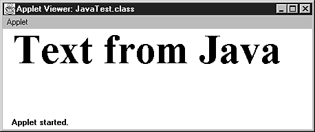 Notice that the applet viewer shows the output of the Java applet, but does not include the text from the HTML file itself. This may be useful when you're debugging a Java applet. To see the entire HTML file including the applet, you'll need to use a browser, such as Netscape.