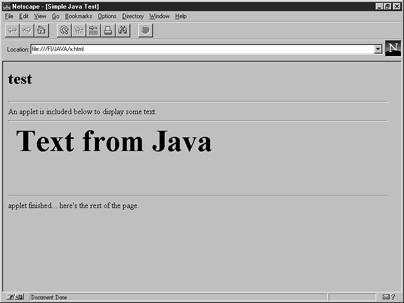 To test the applet in Netscape, simply use the Open command to load the HTML file created previously. Figure 16.2 shows the applet example as viewed by Netscape.