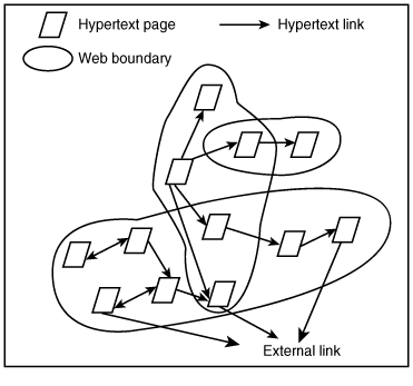 An important way to express information organization in hypertext is through diagrams that express linking relationships. In a system of webs, individual webs and pages within those webs might have many links between them. Some links might be from page to page or to webs outside the system. Figure 11.1 shows a diagram depicting the organization of a sample web system. The boundaries of the webs overlap when pages are shared among the webs.