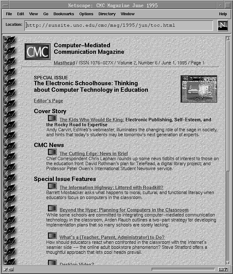 Figure 11.11 illustrates an example of a web page designed using multiple graphic slabs to direct user attention. The graphic elements for "Cover Story," "CMC News," and "Special Issue Features" direct the user to groups of links and information. The cover thumbnail at the right in the figure and the CMC logo at the top of the page serve as navigational links to more information about this publication and its cover illustration. This example also displays a textured background to give the web page a particular feel or mood through graphics.
