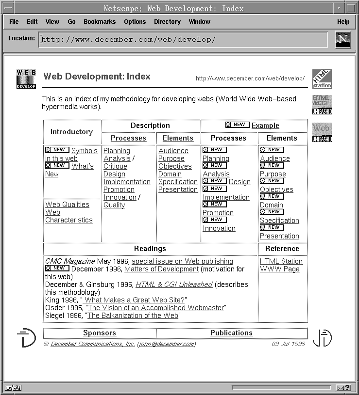 You can get a good idea of the kind of information that a web implementer and designer works with and produces by looking at the web design and implementation documentation that I've prepared for the Web Development web (http://www.december.com/web/develop.html). You can take a look at the design information I have there at http://www.december.com/web/develop/wddesign.html and the implementation information at http://www.december.com/web/develop/wdimplement.html. |