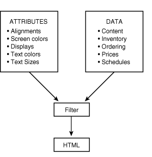 When a web page is called by a client, the data or information that is to be sent to the client first passes through the display filter so that the proper display elements can be applied and executed. The information inherits whatever layout qualities you have specified in the attribute file. If you determine that a horizontal rule will come between every separate paragraph, for example, this page-display characteristic is executed whenever one paragraph ends and another begins. Figure 27.1 represents the main points of intersection among the various DIDDS elements.