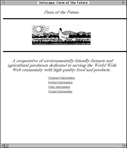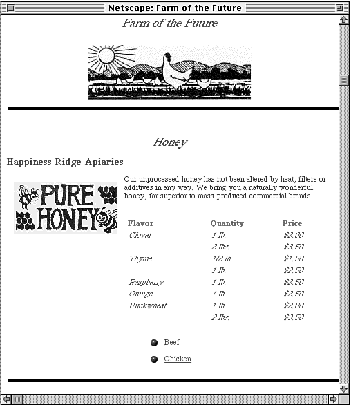 The client (a fictitious entity) posing the challenge is the Farm of the Future. The Farm of the Future consists of three independent producers of small-scale, organic agricultural products: chicken, beef, and honey. The cooperative is interested in pursuing a Web strategy that effectively promotes the individual care and attention each of the independent producers gives their products, while at the same time emphasizing the features and qualities shared by all three. The cooperative wants to develop a shared look and feel for the Web site, as well as use a common ordering system. Cooperative members expect their products, descriptions, and prices to change frequently, and the cooperative members want to avoid high maintenance costs by updating their own pages.