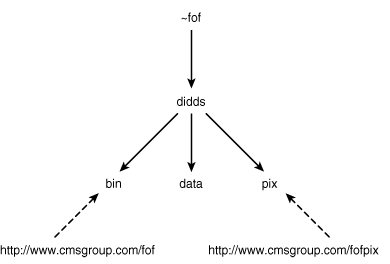 In this manner, access to the images does not allow outside users to access the data or script directories. Of course, this assumes that the server has the security configured correctly. Figure 27.4 provides an illustration of these directories. The solid lines indicate the hierarchy and the dotted lines indicate the directories that are called by corresponding URLs.