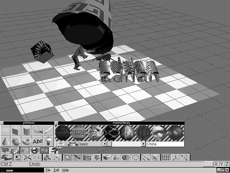 Pioneer also has great 3-D text. You use the text primitive to write some letters, use the Sweep tool to turn the text into 3-D, and then twist it out as far as you want. It's fun to paint the 3-D text with different materials.