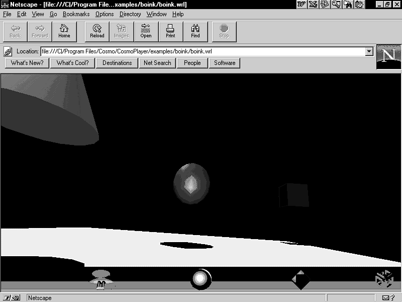 Unfortunately, Netscape Navigator does not provide plugin management software. This means that if you want to switch between different VRML browsers, it can get difficult. As a worst case scenario, you can try uninstalling one VRML browser and installing another. However, there is another way. You can rename the DLL file containing the VRML browser. Netscape Navigator looks for the first VRML DLL alphabetically. When I want to switch from Cosmo Player to Live3D in Windows 95, I choose Find from the Start menu, choose Files or Folders, and search for the file npcosmop.dll. After it is found, I rename it xnpcosmop.dll. The letter x in front places the DLL after the Live3D DLL in the alphabet so that Netscape will start the Live3D VRML plugin when it is rendering a VRML world.