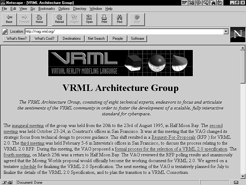 If you're interested in the latest information on the VRML specification and where it's headed, the VRML Architecture Group's Web site (http://vag.vrml.org) has links to the VRML specifications (see Fig. 28.7). It also periodically holds Web-based polls on the future of VRML.