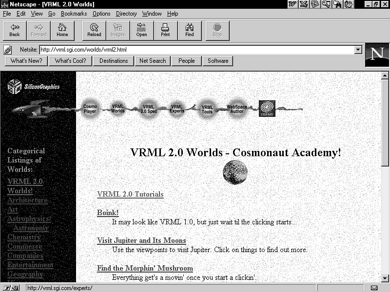 Silicon Graphics VRML site (http://vrml.sgi.com) focuses on its new VRML product, Cosmo Player (a VRML 2.0 browser) as well as its multimedia authoring environment, Cosmo Create. The site includes VRML examples, especially VRML 2.0 examples, plus links to other resources, such as VRML tutorials (see Fig. 28.8).