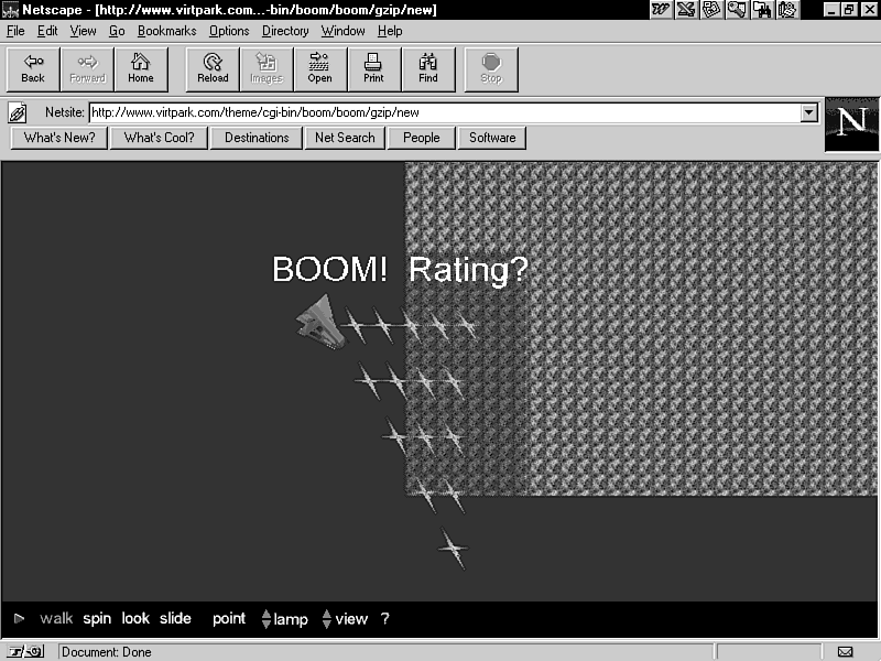 Aereal BOOM! (http://www.aereal.com/boom) is built on a database of more than 1,000 VRML URLs. Visitors get a random VRML URL from the database and can rate the world, giving it one to five stars (see Fig. 28.9). Their rating is entered into the database, and they receive a new world. The randomization is skewed toward worlds that other people have rated highly.