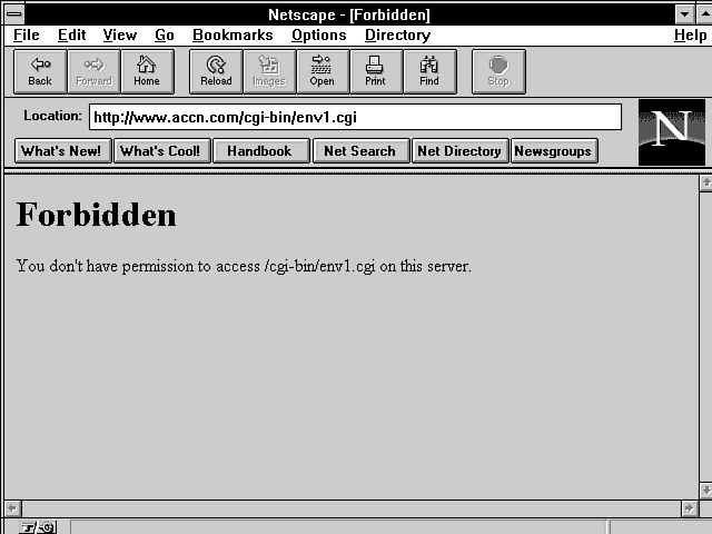 This is probably one of the most common reasons for CGI programs not working the first time. If you are using an interpretive language like Perl, you never run a compile and link command, so the system doesn't automatically change the file permissions to Execute. If you write a perfectly good Perl program and then try to run it from the command line, you might get an error message like Permission denied. If you test out your CGI program from your Web browser, however, you are likely to get an error like the one shown in Figure 1.1-an Internet file error with a status code of 403. This error code seems kind of ominous the first time you see it, and it really doesn't help you very much in figuring out what the problem is.
