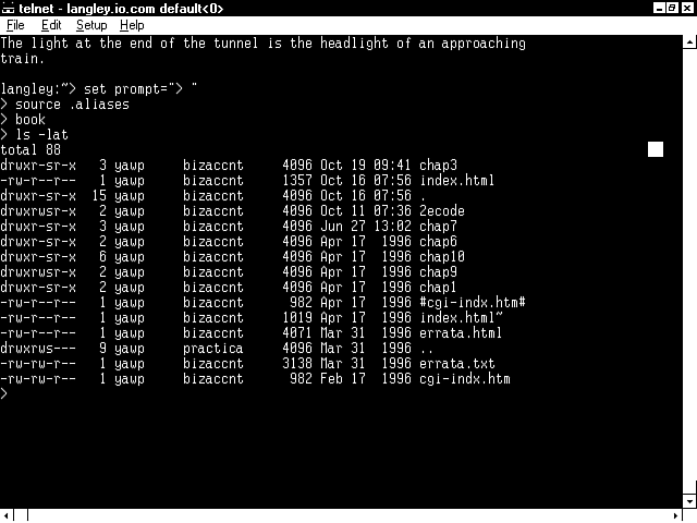 When you create a file, it is created with your username and your groupname as the owner and groupname of the file. The file's Read, Write, and Execute permissions are set for the owner, the group, and other (sometimes referred to as world). This is very important because your Web page is likely to be accessed by anybody in the world. Usually, your Web server runs as user Nobody. This means that when your CGI program is executed or your Web page is opened for reading a process with a groupname different than the groupname you belong to, someone else will be accessing your files. You must set your file-access permissions to allow your Web server access to your files. This usually means setting the Read and Execute privileges for the world or other group. Figure 1.2 shows a listing of the files in one of my business directories. You can see that most of the files have rw privileges for the owner and Read privileges only for everyone else. Notice that the owner is yawp (that's my personal user name) and the group is bizaccnt. You can see that directories start with a d, as in the drwxr-xr-x permissions set. The d is set automatically when you use the mkdir command.