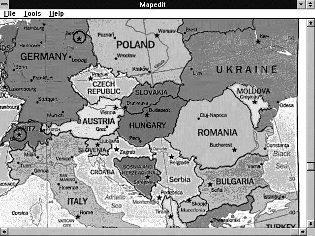 Okay, let's go back to the more realistic example of mapping hotspots onto the European map shown in Figure 9.6. Now you really don't need a lot of fancy tools for building mapfiles. They are only text files, and the format is relatively simple. This makes editing the mapfile easy after it is created, but creating all the points that go with the sample mapfile of Europe would be too much work. I therefore use a program called mapedit to build my mapfile, which is shown in Listing 9.6.