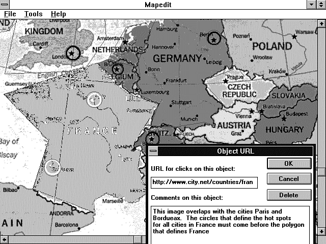 01: default http://www.accn.com/cgi-bin/return-same-location.cgi 02: #Ireland 03: circle http:/www.city.net/countries/ireland/dublin 219,703 223,691 04: #Switzerland 05: circle http:/www.city.net/countries/switzerland/bern 493,948 501,936 06: poly bern 209,623 227,631 193,653 197,667 211,661 227,676 225,719 209,736 135,749 103,683 209,622 07: #United Kingdom 08: circle http:/www.city.net/countries/united_kingdom/london 336,781 352,777 09: #Belgium 10: circle http:/www.city.net/countries/belgium/brussels 423,812 425,823 11: #France 12: circle http:/www.city.net/countries/france/paris 378,872 362,874 13: #France 14: circle http:/www.city.net/countries/france/bordeaux 296,1006 303,1022 15: #Germany 16: circle http:/www.city.net/countries/germany/berlin 613,750 613,765 17: #United Kingdom - This image overlaps with the city of 18: #London. The circles that define the hotspots 19: #for all cities in the United Kingdom must come before the polygon 20: #that defines London 21: poly http:/www.city.net/countries/united_kingdom 195,655 214,659 230,672 234,705 175,825 361,807 393,739 360,444 189,544 229,627 213,657 22: #Belgium - This image overlaps with the city of 23: #Brussels. The circles that define the hotspots 24: #for all cities in Belgium must come before the polygon 25: #that defines Brussels. 26: poly http:/www.city.net/countries/belgium 400,792 423,798 437,790 458,804 468,827 454,859 420,841 384,801 414,785 27: #France - This image overlaps with the cities Paris and 28: #Bordeaux. The circles that define the hotspots 29: #for all cities in France must come before the polygon 30: #that defines France 31: poly http:/www.city.net/countries/france 386,801 392,815 420,841 445,857 471,871 505,879 487,923, 478,925 453,961 471,983 465,1007 32: 483,1051 464,1074 376,1093 253,1048 265,923 216,876 221,860 289,834 385,800 #Switzerland - This image overlaps with the city of 33: #Bern. The circles that define the hotspots 34: #for all cities in Switzerland must come before the polygon 35: #that defines Bern 36: poly http:/www.city.net/countries/switzerland 479,927 513,918 535,929 535,939 554,947 556,961 548,969 522,981 497,981 474,981 455,961 37: #Germany - This image overlaps with the city of 38: #Berlin. The circles that define the hotspots 39: #for all cities in Germany must come before the polygon 40: #that defines Berlin 41: poly http:/www.city.net/countries/germany 481,726 515,680 607,683 626,709 650,805 591,833 630,880 604,902 615,924 531,924 487,918 Mapedit is a WYSIWYG (What You See Is What You Get) editor for imagemap files. Mapedit is available at http://www.boutell.com/mapedit/